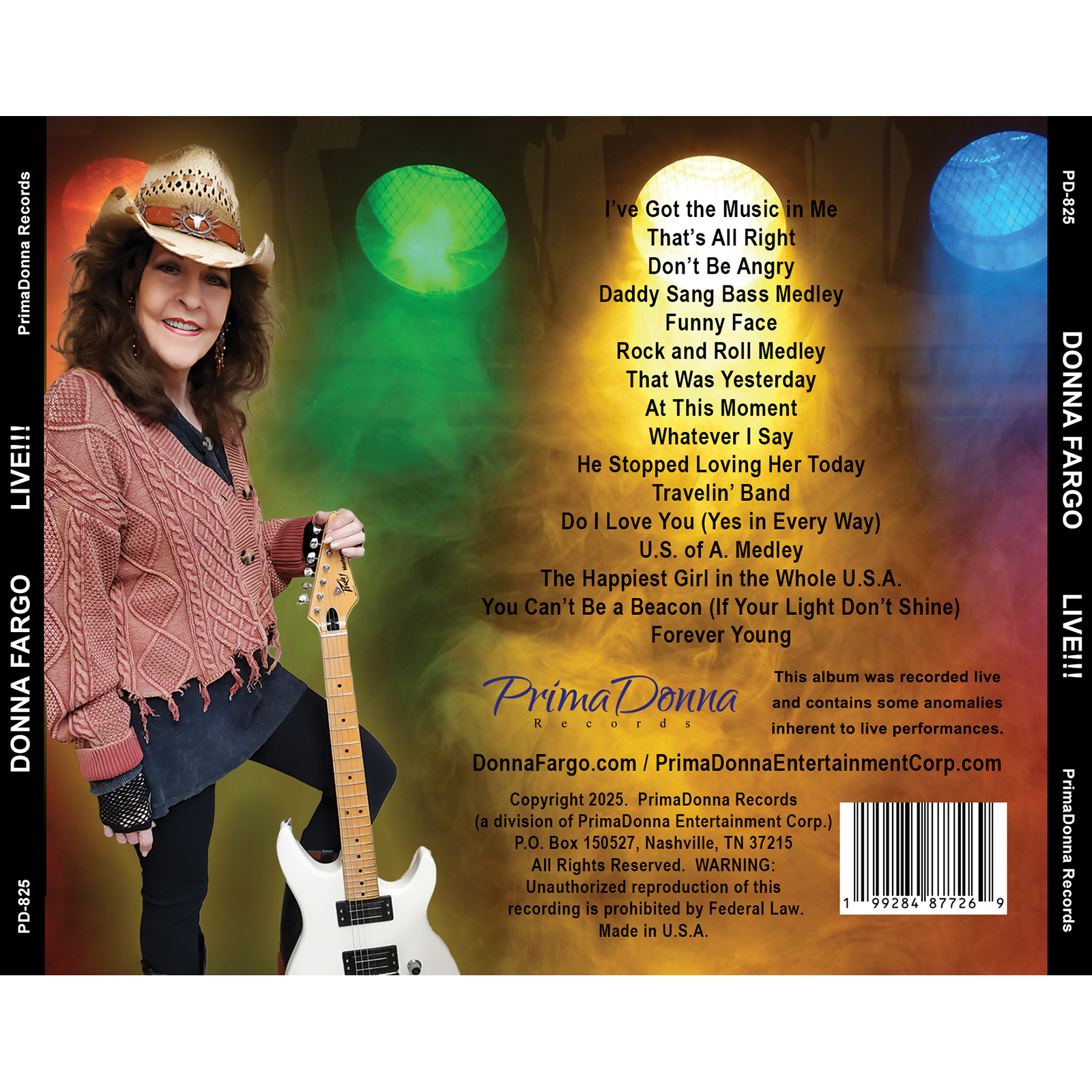 Experience Donna Fargo like you’ve never heard her before with her brand-new LIVE!!! CD, released just yesterday and available on CD only. Recorded onstage at the iconic Whiskey Pete’s in Nevada, this energy-packed performance captures the warmth, humor, and unmistakable charm that fans love.
